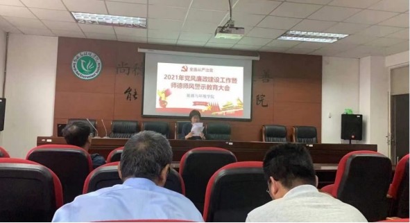 为深入推进党史学习教育,传达公司全面从严治党工作会议精神,进一步强化党风廉政和师德师风建设,引导干部教师廉洁从政从教,加强规范教师职业行为,2021年5月14日下午在秋实楼B405召开2021年党风廉政建设会议暨师德师风警示教育大会,公司党委书记张鑫主持本次会议,全院教职工参加。