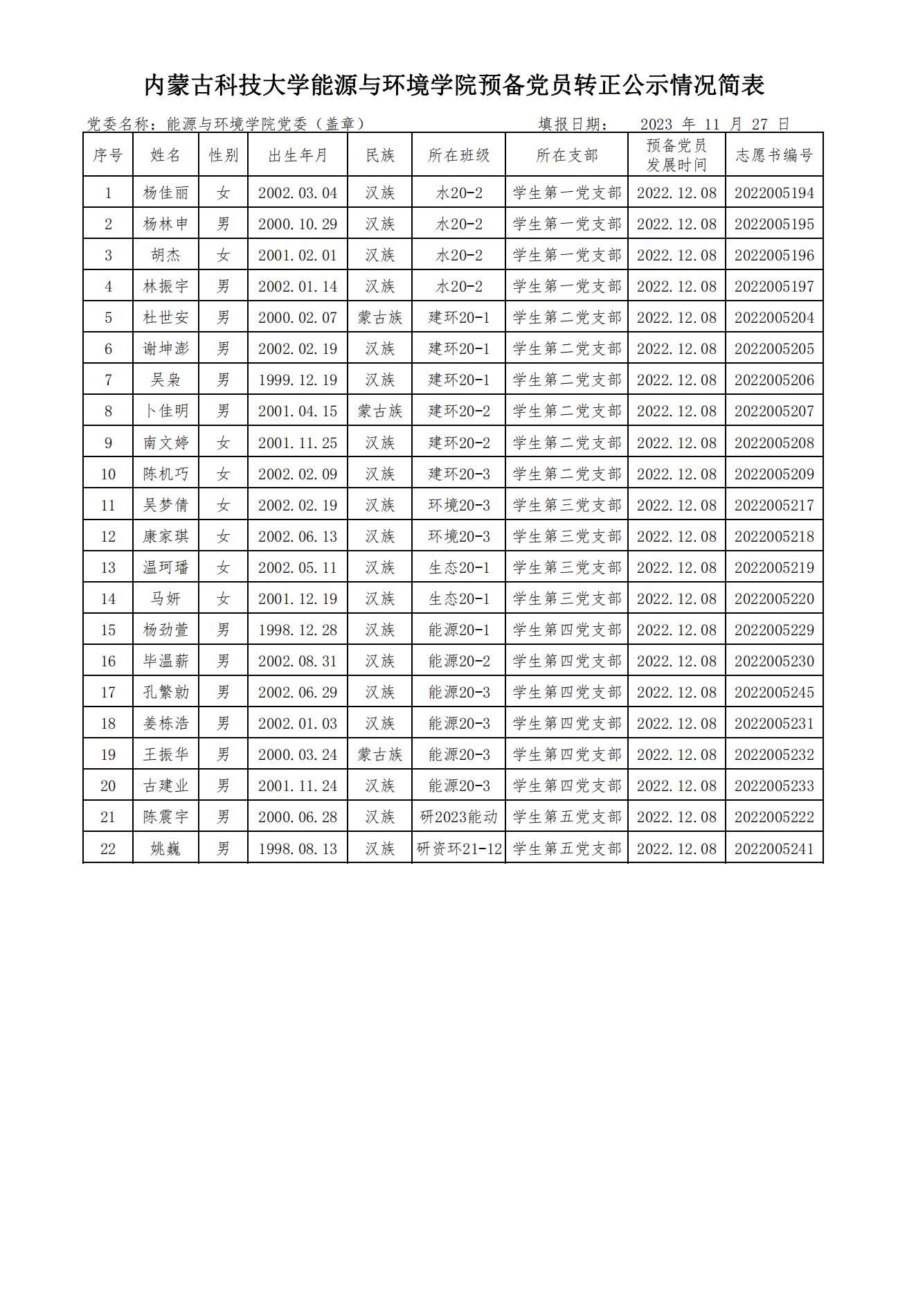 经过一年的教育和考察,杨佳丽、杨林申、胡杰、林振宇、杜世安、谢坤澎、吴枭、卜佳明、南文婷、陈机巧、吴梦倩、康家琪、温珂璠、马妍、杨劲萱、毕温薪、孔繁勍、姜栋浩、王振华、古建业、陈震宇、姚巍共二十二位同志预备期将满,公司各党支部拟在近期召开党员大会讨论他们的转正问题。为进一步增强发展党员工作的透明度,严格发展党员工作程序,根据《中国共产党章程》和《中国共产党发展党员工作细则》,现将近期拟转正的预备党员情况予以公示。
